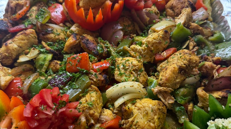 Marinated grilled chicken cooked with fresh vegetables, available in both full and half catering trays.